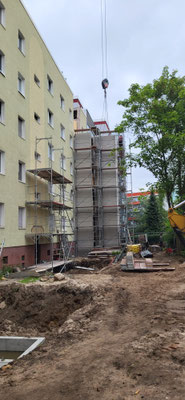 Am Eckgrundstück Wegeberg 2-8 / Heide 1 beginnen wir mit dem Anbau der Aufzüge, gleichzeitig werden neue Balkone angebracht, die Fassade und Treppenhäuser werden modern und freundlich gestaltet.